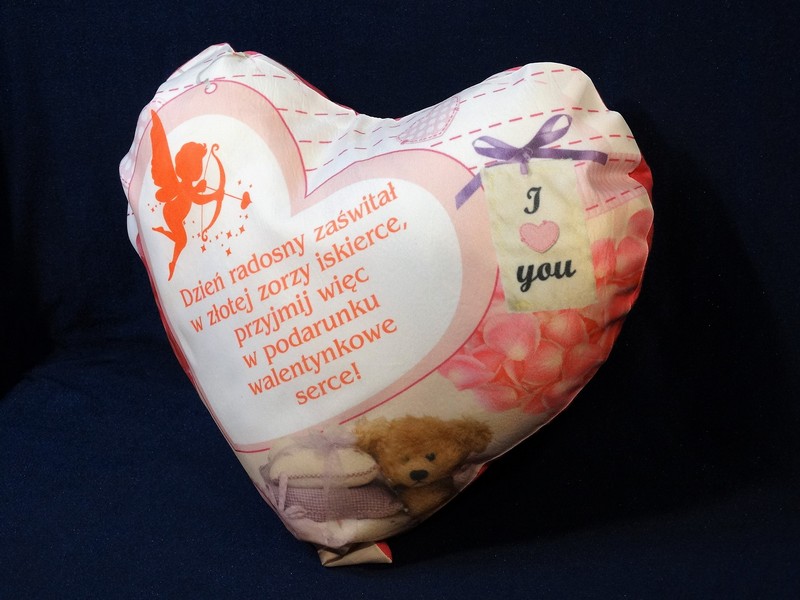 Upominek dla zakochanych w postaci poszewki w kształcie serca z polem do nadruku.